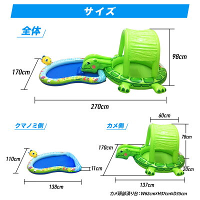 子どもも大人も家族みんなで楽しめるBIGサイズ! さらにすべり台付きで楽しさ倍増!!! 商 品 詳 細 内容 ビニールプール本体 ×1 すべり台 ×1 サイズ 全体:(約)幅270×奥行き170×高さ98cm クマノミ側:(約)幅138×奥行き110×高さ11cm カメ側:(約)幅137×奥行き170×高さ98cm カメ頭部すべり台:(約)幅62×奥行き35×高さ37cm 素材 PVC(ポリ塩化ビニール) 対象年齢 4歳以上〜 特徴 簡単組立 セパレート式すべり台 着地クッション ゆったりロングサイズ 水抜きバルブ 空気抜きバルブ 保証期間 7日間 ※商品到着後7日以内の初期不良・破損のみご対応させていただきます。